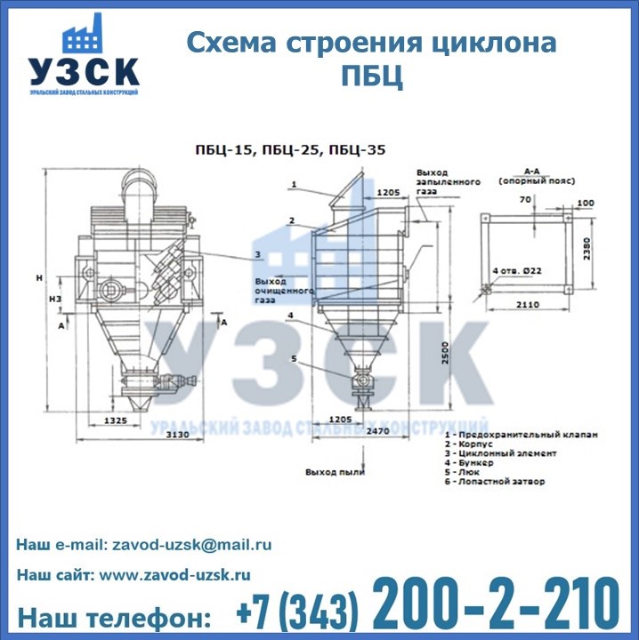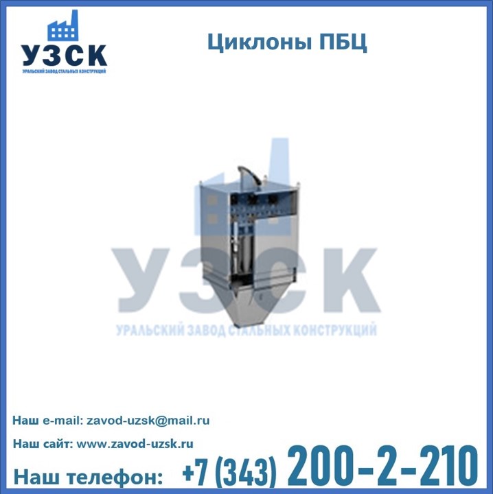 Завод «УЗСК» в Новошахтинске предлагает приобрести циклоны ПБЦ и прочие устройства, полностью укомплектованные и готовые к эксплуатации. Мы гарантируем соответствие оборудования всем требованиям ГОСТ и ТУ, износостойкость и высокую производительность предлагаемого оборудования. Уральский Завод Стальных Конструкций изготавливает и продает надежное, эффективное и производительное оборудование, имеющее длительную гарантию и большой эксплуатационный ресурс. Если требуется изготовить циклон нестандартных размеров, то такой вариант выполнения заказа тоже предусмотрен, так как предприятие имеет собственные производственные площади и надежных поставщиков. На все поставляемое или производимое оборудование имеются чертежи и прочая техническая документация. Заказать и купить циклоны или прочее оборудование высокого качества и по доступной цене можно через наш сайт или по указанному в разделе «Контакты» телефону.
